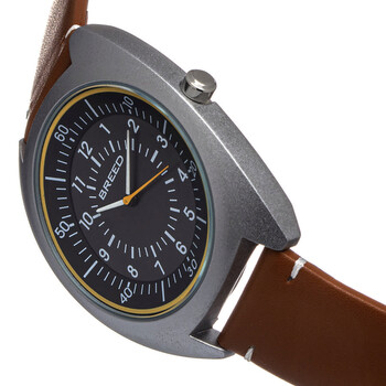 Silver-tone alloy case with a brown leather strap. Fixed silver-tone alloy bezel. Grey dial with white hands and Arabic numeral hour markers. Arabic numeral minute markers (at 10 minute intervals). Minute markers around the outer rim. Dial Type: Analog. Quartz movement. Scratch resistant mineral crystal. Pull / push crown. Solid case back. Tonneau case shape. Case size: 43 mm. Case thickness: 8 mm. Band width: 20 mm. Band length: 8.5 inches. Tang clasp. Water resistant at 50 meters / 165 feet. Functions: hour, minute, second. Victor Series. Casual watch style. Breed Victor Quartz Grey Dial Men's Watch BRD9201.