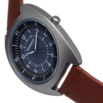 Silver-tone alloy case with a brown leather strap. Fixed silver-tone alloy bezel. Grey dial with white hands and Arabic numeral hour markers. Arabic numeral minute markers (at 10 minute intervals). Minute markers around the outer rim. Dial Type: Analog. Quartz movement. Scratch resistant mineral crystal. Pull / push crown. Solid case back. Tonneau case shape. Case size: 43 mm. Case thickness: 8 mm. Band width: 20 mm. Band length: 8.5 inches. Tang clasp. Water resistant at 50 meters / 165 feet. Functions: hour, minute, second. Victor Series. Casual watch style. Breed Victor Quartz Grey Dial Men's Watch BRD9202.