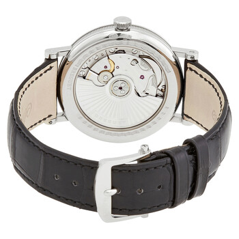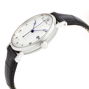 18kt white gold case with a black crocodile leather strap. Fixed 18kt white gold bezel. Silver-tone dial with blue hands and Roman numeral hour markers. Minute markers around the outer rim. Dial Type: Analog. Date display at the 3 o'clock position. Breguet Calibre 777Q automatic movement with a 44-hour power reserve. Scratch resistant sapphire crystal. Transparent case back. Case size: 38 mm, case thickness: 8.8 mm. Round case shape. Buckle clasp. Water resistant at 30 meters / 100 feet. Functions: date, hour, minute, second. Luxury watch style. Watch label: Swiss Guilloche Main. Breguet Classique 18kt White Gold Automatic Silver Dial Men's Watch 5177BB/15/9V6.