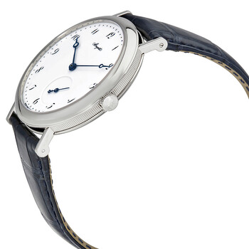 18kt white gold case with a blue leather strap. Fixed 18kt white gold bezel. White dial with blue hands and Arabic hour markers. Minute markers around the outer rim. Dial Type: Analog. Small seconds sub-dial above the 6 o'clock position. Breguet calibre 583 Q/1 automatic movement with a 46-hour power reserve. Scratch resistant sapphire crystal. Pull / push crown. Solid case back. Case size: 40 mm. Case thickness: 10.8 mm. Round case shape. Tang clasp. Water resistant at 30 meters / 100 feet. Functions: hour, minute, second. Luxury watch style. Watch label: Swiss Made. Breguet Classique Automatic Silver Dial 18kt White Gold Men's Watch 5140BB299W6.
