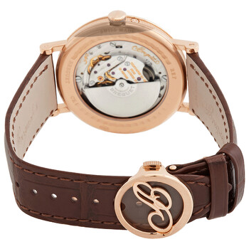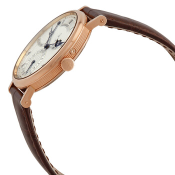 18kt rose gold case with a brown alligator/crocodile leather strap. Fixed 18kt rose gold bezel. Silver dial with blue hands and Roman numeral hour markers. Minute markers around the outer rim. Dial Type: Analog. Date display at the 6 o'clock position. Moonphase, power reserve indicator, date subdials. Breguet Calibre 502.3 DR1 Automatic movement, containing 37 Jewels, composed of 256 parts, bitting at 21600 vph, and has a power reserve of approximately 46 hours. Scratch resistant sapphire crystal. Pull / push crown. Transparent case back. Round case shape, case size: 39 mm, case thickness: 8.65 mm. Deployant buckle clasp. Water resistant at 30 meters / 100 feet. Functions: moon phase, date, hour, minute, power reserve indicator. Classique Series. Luxury watch style. Watch label: Swiss Guilloche Main. Breguet Classique Automatic Silver Dial Men's Watch 7137br/15/9vu.