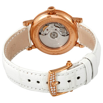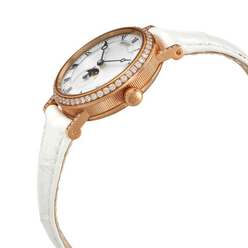 18kt rose gold case with a white (alligator) leather strap. Fixed 18kt rose gold bezel set with diamonds. Mother of pearl dial with blue hands and Roman numeral hour markers. Minute markers around the outer rim. Dial Type: Analog. Moonphase display. Breguet calibre 537L automatic movement, containing 26 Jewels, bitting at 25200 vph, and has a power reserve of approximately 45 hours. Scratch resistant sapphire crystal. Pull / push crown. Transparent case back. Round case shape. Case size: 30 mm. Case thickness: 9.8 mm. Tang clasp. Water resistant at 30 meters / 100 feet. Functions: moon phase, hour, minute. Classique Series. Dress watch style. Watch label: Swiss Guilloche Main. Breguet Classique Moon Phase Automatic Ladies Watch 9088BR/52/964/DD0D.