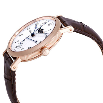 18kt rose gold case with a brown (alligator) leather strap. Fixed 18kt rose gold bezel. White dial with blue hands and Arabic numeral hour markers. Minute markers around the outer rim. Dial Type: Analog. Two sub-dials displaying: moon phase and power reserve indicator. Breguet calibre 591 DRL automatic movement, containing 25 Jewels, bitting at 28800 vph, and has a power reserve of approximately 38 hours. Scratch resistant sapphire crystal. Pull / push crown. Transparent case back. Round case shape. Case size: 39 mm. Case thickness: 10.5 mm. Tang clasp. Water resistant at 30 meters / 100 feet. Functions: hour, minute, second, moonphase, power reserve. Classique Moonphase Power Reserve Series. Luxury watch style. Watch label: Swiss Made. Breguet Classique Moonphases Automatic White Dial 18K Rose Gold Men's Watch 7787BR299V6.