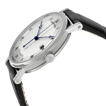 Gold 18kt white case with a black leather strap. Fixed 18kt white gold bezel. Silver dial with blue hands and Roman numeral hour markers. Minute markers around the outer rim. Dial Type: Analog. Date display at the 3 o'clock position. Breguet calibre 777Q automatic movement with a 55-hour power reserve. Scratch resistant sapphire crystal. Pull / push crown. Transparent case back. Case size: 38 mm. Case thickness: 8.25 mm. Round case shape. Band width: 19 mm. Deployment with push button release clasp. Water resistant at 30 meters / 100 feet. Functions: date, hour, minute, second. Casual watch style. Watch label: Swiss Made. Breguet Classique Silver Dial 18kt White Gold Men's Watch 5177BB129V6.