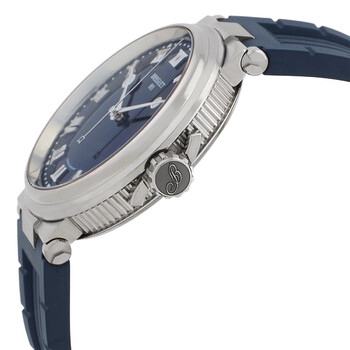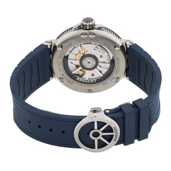 Grey titanium case with a blue rubber strap. Fixed grey titanium bezel. Blue dial with silver-tone hands and Roman numeral hour markers. Minute markers around the outer rim. Dial Type: Analog. Luminescent hands and markers. Date display at the 3 o'clock position. Automatic movement. Scratch resistant sapphire crystal. Screw down crown. Transparent see through case back. Round case shape, case size: 40 mm. Deployment with push button release clasp. Water resistant at 100 meters / 330 feet. Functions: date, hour, minute, second. Additional Info: original box, international warranty card, manual (complete accessories). Marine Series. Luxury watch style. Watch label: Swiss Made. Breguet Marine Automatic Blue Dial Men's Watch 5517TI/Y1/5ZU.