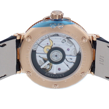 18kt rose gold case with a brown leather strap. Fixed 18kt rose gold bezel. Silver dial with rose gold-tone hands and Roman numeral hour markers. Minute markers around the outer rim. Dial Type: Analog. Luminescent hands and markers. Date display at the 3 o'clock position. Breguet Calibre 777A Automatic movement, containing 26 Jewels, bitting at 28800 vph, and has a power reserve of approximately 55 hours. Scratch resistant sapphire crystal. Screw down crown. Transparent case back. Round case shape, case size: 40 mm, case thickness: 11.50 mm. Deployment clasp. Water resistant at 100 meters / 330 feet. Functions: date, hour, minute, second. Marine Series. Luxury watch style. Watch label: Swiss Made. Breguet Marine Automatic Silver Dial Men's 18kt Rose Gold Watch 5517BR/12/9ZU.