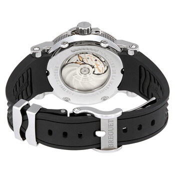 Silver-tone stainless steel case with a black rubber strap. Fixed stainless steel bezel. Silver dial with blue hands and Roman numeral hour markers. Minute markers around the outer rim. dual time with arabic numerals and minute markers around the outer rim. Dial Type: Analog. Luminescent hands. Date display at the 6 o'clock position. Two - dual time and 24 hour subdials. Breguet Calibre 517F automatic movement with a 55-hour power reserve. Scratch resistant sapphire crystal. Pull / push crown. Transparent sapphire case back. Round case shape, case size: 42 mm, case thickness: 12.25 mm. Fold over clasp. Water resistant at 100 meters / 330 feet. Functions: GMT, second time zone, hour, minute, second, 24 hours. Luxury watch style. Watch label: Swiss Made. Breguet Marine Dual Time Silver Dial Black Rubber Men's Watch 5857ST/12/5ZU.