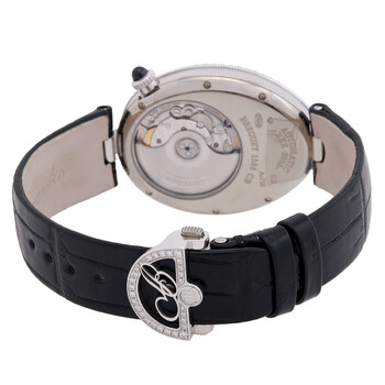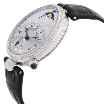 18kt white gold case with a black alligator/crocodile leather strap. Fixed 18kt white gold bezel with diamond set. Mother of pearl dial with blue hands and Roman numeral hour markers. Dial Type: Analog. Two sub-dials displaying: moonphase/power reserve indicator and small second. Breguet Calibre 537 DRL1 Automatic movement, containing 22 Jewels, composed of 230 parts, bitting at 21600 vph, and has a power reserve of approximately 40 hours. Scratch resistant sapphire crystal. Pull / push crown. Transparent case back. Oval case shape, case size: 28.48 mm x 36.5 mm, case thickness: 10.05 mm. Deployant buckle clasp. Water resistant at 30 meters / 100 feet. Functions: moon phase, hour, minute, small second, power reserve indicator. Reine De Naples Series. Luxury watch style. Breguet Reine De Naples Automatic Diamond Ladies Watch 8908bb/52/964/d00d3L.