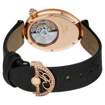 Rose gold-tone 18kt rose gold case with a black satin strap. Fixed rose gold-tone 18kt rose gold set with diamonds bezel. Diamond pave dial with blue hands and Arabic numeral hour markers. Dial Type: Analog. Breguet Calibre 586 Automatic movement, containing 29 Jewels, bitting at 21600 vph, and has a power reserve of approximately 38 hours. Scratch resistant sapphire crystal. Pull / push crown. Solid case back. Oval case shape, case size: 33 mm x 24.95 mm, case thickness: 8.6 mm. Band width: 14 mm. Deployment clasp. Water resistant at 30 meters / 100 feet. Functions: hour, minute. Reine De Naples Series. Luxury watch style. Item Variations: 8928BR/8D/844 DD0D, 8928BR/8D/844-DD0D, 8928BR/8D/844/DD0D, 8928BR/8D/844DD0D. Breguet Reine de Naples Automatic Diamond Ladies Watch 8928BR/8D/844.DD0D.