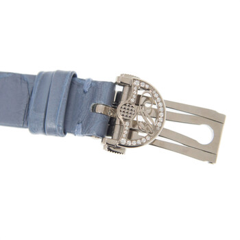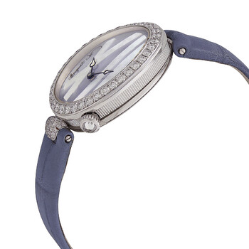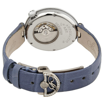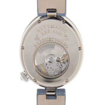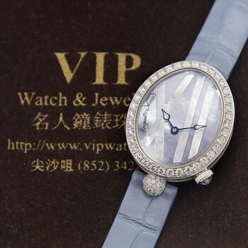 18kt white gold case with a blue (alligator) leather strap. Fixed 18kt white gold brezel set with diamonds. Purple mother of pearl dial with blue skeleton hands. No markers. Dial Type: Analog. Breguet calibre 586/1 automatic movement, containing 29 Jewels, bitting at 21600 vph, and has a power reserve of approximately 38 hours. Scratch resistant sapphire crystal. Screw down crown. Transparen case back. Oval case shape. Case dimensions: 32.7 mm x 27.3 mm. Case thickness: 10.02 mm. Deployment clasp. Water resistant at 30 meters / 100 feet. Functions: hour, minute. Reine De Naples Series. Luxury watch style. Watch label: Swiss Made. Breguet Reine de Naples Automatic Diamond Ladies Watch 9818BB/5V/922/DD0D.