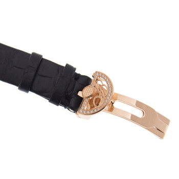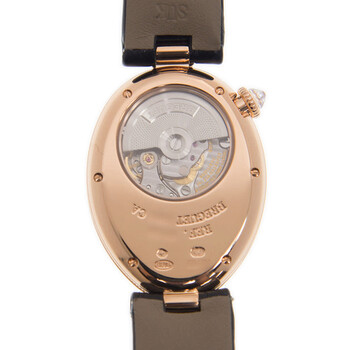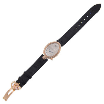 Rose gold-tone 18kt rose gold case with a black leather strap. Fixed rose gold-tone diamond set bezel. Diamond pave dial with blue hands and Arabic numeral hour markers. Dial Type: Analog. Breguet Calibre 586/1 automatic movement with a 38-hour power reserve. Scratch resistant sapphire crystal. Pull / push crown. Transparent case back. Oval case shape. Case size: 25 mm. Jewelry clasp. Water resistant at 30 meters / 100 feet. Functions: hour, minute. Luxury watch style. Watch label: Swiss Made. Breguet Reine de Naples Automatic Diamond Unisex Watch 8928BR/8D/944.DD0D.
