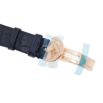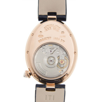 18kt rose gold case with a blue alligator band. Fixed 18kt rose gold bezel with diamond set. Champagne mother of pearl dial with blue Breguet-style shape hands and black Arabic numeral hour markers. Dial Type: Analog. Breguet Calibre 537/3 Automatic movement, containing 26 Jewels, bitting at 21600 vph, and has a power reserve of approximately 45 hours. Scratch resistant sapphire crystal. Solid case back. Oval case shape, case size: 28.45 mm x 36.5 mm, case thickness: 10.05 mm. Water resistant at 30 meters / 100 feet. Functions: hour, minute. Additional Info: bezel set with a total of 117 round diamonds (0.99 carats). Reine De Naples Series. Luxury watch style. Watch label: Swiss Made. Breguet Reine de Naples Champagne Mother of Pearl Dial Automatic Ladies Watch 8918BR/5T/964.D00D.