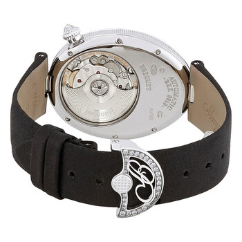 18kt white gold case with a black satin strap. Fixed 18kt white gold bezel set with 117 diamonds. Mother of pearl dial with blue hands and Arabic numeral hour markers. A pear-shaped diamond set at the 6 o'clock position. Minute markers around the inner ring. Dial Type: Analog. Automatic movement. Breguet caliber 537/1 engine with about 40 Hour power reserve. Scratch resistant sapphire crystal. Pull / push crown set with a single diamond. Transparent case back. Case dimensions: 28.45 mm x 36.5 mm. Case thickness: 10.05 mm. Oval case shape. Band width: 17.8 mm. Band length: 7 inches. Deployment clasp. Water resistant at 30 meters / 100 feet. Functions: hour, minute. Luxury watch style. Watch label: Swiss guilloche main. Item Variations: 8918bb/58/864 d00d, 8918bb/58/864-d00d, 8918bb/58/864/d00d, 8918bb/58/864d00d. Breguet Reine De Naples Mother of Pearl Dial Diamond Automatic Ladies Watch 8918BB58864D00D.