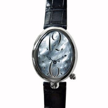 Stainless steel case with a blue alligator leather strap. Fixed stainless steel bezel. Blue mother of pearl dial with blue hands and stick hour markers. Arabic numerals mark the 6 and 12 o'clock positions. Dial Type: Analog. Automatic movement with a 38-hour power reserve. Scratch resistant sapphire crystal. Skeleton case back. Case dimensions: 35.5 mm x 43.75 mm. Case thickness: 9.45 mm. Oval case shape. Deployment clasp with push button erelease. Water resistant at 30 meters / 100 feet. Functions: hour, minute. Luxury watch style. Watch label: Swiss Made. Breguet Reine de Naples Blue Mother of Pearl Dial Leather Ladies Watch 8967ST/V8/986.