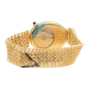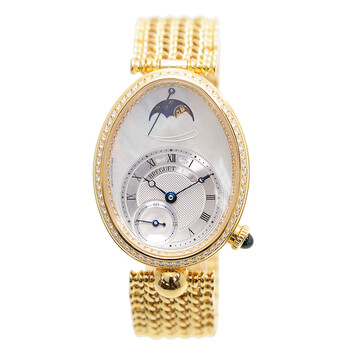 18kt yellow gold case with a yellow gold-tone 18kt yellow gold bracelet. Fixed 18kt yellow gold bezel with diamond set. White mother of pearl dial with blue Breguet-style shape hands and Roman numeral hour markers. Dial Type: Analog. One subdial displaying: moonphase/power reserve indicator. Breguet Calibre 537 DRL1 Automatic movement, containing 22 Jewels, composed of 230 parts, and has a power reserve of approximately 40 hours. Scratch resistant sapphire crystal. Pull / push crown. Transparent see through case back. Oval case shape, case size: 28.45 mm x 26.5 mm, case thickness: 10.05 mm. Deployment clasp. Water resistant at 30 meters / 100 feet. Functions: moon phase, hour, minute, small second, power reserve indicator. Reine De Naples Power Reserve Series. Luxury watch style. Item Variations: 8908BA/52/J20 D000, 8908BA/52/J20-D000, 8908BA/52/J20/D000, 8908BA/52/J20D000. Breguet Reine de Naples Power Reserve Automatic Diamond Ladies Watch 8908BA/52/J20.D000.