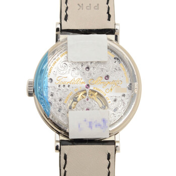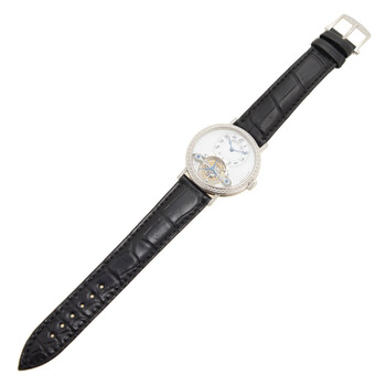 18kt white gold case with a black leather strap. Fixed 18kt white gold bezel with diamond set. Mother of pearl dial with blue-toned hands and Arabic hour markers. Minute markers around the outer rim. Dial Type: Analog. One subdial displaying: tourbillon/small second. Breguet Calibre 558.1 Hand Wind movement, containing 21 Jewels, composed of 196 parts, bitting at 18000 vph, and has a power reserve of approximately 50 hours. Scratch resistant sapphire crystal. Pull / push crown. Round case shape, case size: 35 mm, case thickness: 9 mm. Deployment clasp. Water resistant at 30 meters / 100 feet. Functions: tourbillon, hour, minute. Additional Info: 74 diamonds (approx. 1.33cts. ). Tourbillon Series. Luxury watch style. Watch label: Swiss. Breguet Tourbillon Mother of Pearl Dial 18kt White Gold Diamond Black Leather Ladies Watch 3358BB52986DD00.