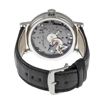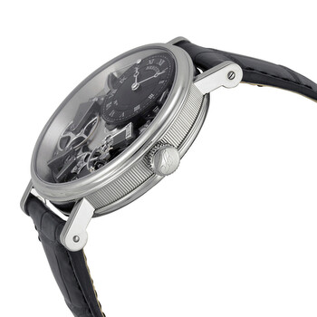 18kt white gold case with a black leather strap. Fixed 18kt white gold bezel. Black and grey skeleton dial with silver-tone hands and Roman numeral hour markers. Minute markers around the outer rim. Dial Type: Analog. Breguet calibre 507 DR hand wind movement with a 50-hour power reserve. Scratch resistant sapphire crystal. Pull / push crown. Transparent case back. Case size: 40 mm. Case thickness: 11.65 mm. Round case shape. Band width: 13 mm. Tang clasp. Water resistant at 30 meters / 100 feet. Functions: hour, minute, power reserve indicator. Luxury watch style. Watch label: Swiss Made. Breguet Tradition Black and Grey Skeleton Dial 18kt White Gold Black Leather Men's Watch 7057BBG99W6.