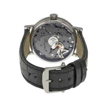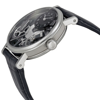 18kt white gold case with a black alligator leather strap. Fixed 18kt white gold bezel. Black skeleton display dial with silver-tone Breguet-style shape hands and Roman numeral hour markers. Minute markers around the outer rim. Dial Type: Analog. One subdial displaying: power reserve indicator. Breguet Calibre 507 DR Hand Wind movement, containing 34 Jewels, composed of 215 parts, bitting at 21600 vph, and has a power reserve of approximately 50 hours. Scratch resistant sapphire crystal. Pull / push crown. Transparent case back. Round case shape, case size: 37 mm, case thickness: 11.8 mm. Tang clasp. Water resistant at 30 meters / 100 feet. Functions: hour, minute, power reserve indicator. Tradition Series. Luxury watch style. Watch label: Swiss Made. Breguet Tradition Black Skeleton Dial 18kt White Gold Black Leather Men's Watch 7027BBG99V6.
