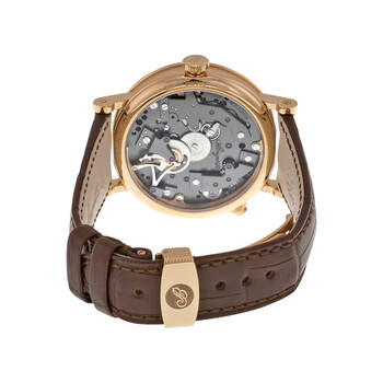 18kt rose gold case with a brown alligator leather strap. Fixed 18kt rose gold bezel. Skeletal dial with blue and silver-tone hands and Roman numeral hour markers. Minute markers around the outer rim. Dial Type: Analog. Two sub-dials displaying: dual time at the 8 o'clock position and 24 hour at the 9 o'clock position. Breguet Calibre 507 DRF Hand Wind movement, containing 40 Jewels, composed of 215 parts, bitting at 21600 vph, and has a power reserve of approximately 50 hours. Scratch resistant sapphire crystal. Transparent sapphire case back. Round case shape, case size: 40 mm, case thickness: 12.65 mm. Deployment clasp. Water resistant at 30 meters / 100 feet. Functions: GMT, second time zone, hour, minute, second, am/pm. Tradition Gmt Series. Luxury watch style. Watch label: Swiss Made. Breguet Tradition GMT Manual Skeletal Dial Leather Men's Watch 7067BRG19W6.
