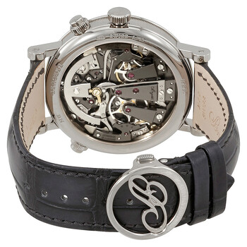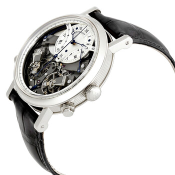 18kt white gold case with a black alligator leather strap. Fixed 18kt white gold bezel. Grey dial with blue Breguet-style shape hands and black Roman numeral hour markers. Minute markers around the outer rim. Dial Type: Analog. Three sub-dials displaying: retrograde 20 minute, 60 second and power reserve indicator. Breguet Calibre 580 DR Hand Wind movement, containing 62 Jewels, bitting at 36000 vph, and has a power reserve of approximately 55 hours. Scratch resistant sapphire crystal. Transparent case back. Round case shape, case size: 44 mm, case thickness: 13.95 mm. Band width: 22 mm. Push button buckle clasp. Water resistant at 30 meters / 100 feet. Functions: chronograph, retrograde, hour, minute, small second, power reserve indicator. Tradition Series. Luxury watch style. Watch label: Swiss Made. Breguet Tradition Men's Watch 7077BB/G1/9XV.