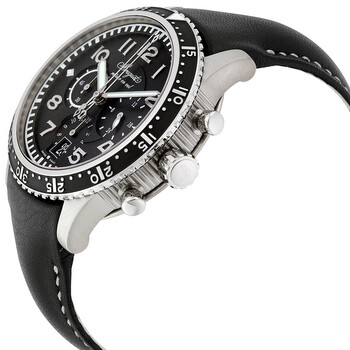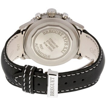 Silver-tone titanium case with a black calfskin leather strap. Uni-directional rotating silver-tone titanium with a black top ring bezel. Black dial with luminous hands and Arabic numeral hour markers. Minute markers around the outer rim. Dial Type: Analog. Luminescent hands and markers. Date display at the 6 o'clock position. Chronograph - three sub-dials displaying: 60 second, 12 hour and 24 hour. Breguet Calibre 584 Q1 Automatic movement, containing 25 Jewels, bitting at 28800 vph, and has a power reserve of approximately 45 hours. Scratch resistant sapphire crystal. Pull / push crown. Solid case back. Round case shape, case size: 42 mm, case thickness: 15.4 mm. Band width: 20.3 mm, band length: 8 inches. Deployment clasp. Water resistant at 100 meters / 330 feet. Functions: chronograph, date, hour, minute, second. Type Xxi Series. Dress watch style. Watch label: Swiss Made. Breguet Transatlantique Type XXI Flyback Automatic Black Dial Black Leather Men's Watch 3810TIH23ZU.