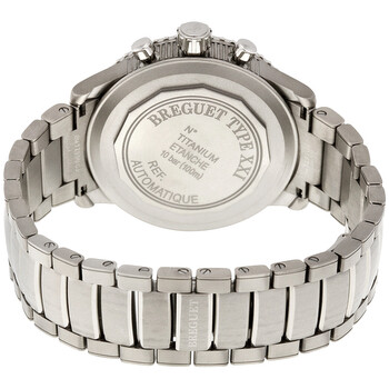 Grey titanium case with a grey titanium bracelet. Uni-directional rotating coin edge titanium bezel with a black top ring count-up elapsed time top ring. Black dial with luminous hands and Arabic hour markers. Minute markers around the outer rim. Dial Type: Analog. Luminescent hands and markers. Date display at the 6 o'clock position. Chronograph - three sub-dials displaying: 60 second, 12 hour and 24 hour. Breguet Calibre 584 Q1 Automatic movement, containing 25 Jewels, bitting at 28800 vph, and has a power reserve of approximately 45 hours. Scratch resistant sapphire crystal. Pull / push crown. Solid case back. Round case shape, case size: 42 mm, case thickness: 15.4 mm. Band width: 20.3 mm. Deployment clasp. Water resistant at 100 meters / 330 feet. Functions: chronograph, date, hour, minute, second. Type Xxi Series. Dress watch style. Watch label: Swiss Made. Breguet Type XXI Transatlantique Flyback Automatic Men's Watch 3810TIH2TZ9.