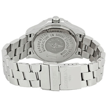 Stainless steel case with a stainless steel bracelet. Unidirectional rotating bezel. Black dial with luminous hands and Arabic numeral hour markers hour markers. Gmt scale on inner ring minute markers around the outer rim. Luminescent hands and dial markers. Date display at the 3 o'clock position. Automatic movement. Scratch resistant sapphire crystal. Screw-locked crown. Case diameter: 40.5 mm. Case thickness: 13.6 mm. Double locking deployment clasp. Water resistant at 500 meters / 1650 feet. Functions: hours/ minutes/ seconds/ date/ 2nd time zone/ luminescent mobile hour marker. AdditionalInfo: date displays at 3 o'clock position; 2nd time zone. Breitling Aeromarine Colt GMT Steel Black Men's Watch A3235011-B715SS