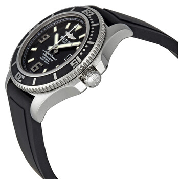 Stainless steel case with a black pro diver (rubber) strap. Unidirectional black ion-plated bezel. Black dial with silver tone hands and index hour markers. Arabic numerals mark the 6 and 9 o'clock positions. minute markers around the outer rim. Dial Type: Analog. Luminescent hands and markers. Date display appears at the 3 o'clock position. Automatic movement. Breitling 17 engine. Scratch resistant sapphire crystal. Screw locked crown. Solid case back. Case diameter: 44 mm. Case thickness: 16.70 mm. Band width: 22/20 mm. Deployment clasp. Water resistant at 2000 meters / 6600 feet. Functions: hours, minutes, seconds, date. Additional Info: 28,800 vibrations per hour, 25 jewels. Luxury Sport watch style. Watch label: Swiss Made. Breitling Aeromarine Superocean 44 Automatic Men's Watch A1739102-BA77BKPD.
