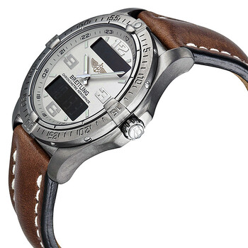Titanium case with a brown leather strap. Bidirectional titanium bezel. Silver dial with luminous hands and index hour markers. 24 hour scale appears around the outer rim. Dial Type: Analog-digital. Digital day and date. Superquartz movement. Scratch resistant sapphire crystal. Pull / push crown. Case diameter: 42 mm. Case thickness: 10.40 mm. Round case shape. Deployment clasp. Water resistant at 100 meters / 330 feet. Functions: digital date, hour, minute, second, countdown timer, 2nd timezone, alarm, minute repeater. Luxury watch style. Watch label: Swiss Made. Breitling Aerospace Advantage Silver Dial Brown Leather Men's Watch E7936210-G606BRLT.