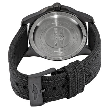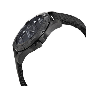 Black DLC titanium case with a anthracite polyamide fabric strap. Uni-directional rotating black DLC titanium bezel. Analog-digital dial with luminous black hands and Arabic numeral hour markers. Minute markers around the outer rim. Dial Type: Analog-digital. Luminescent hands and markers. Digital sub-dial. Breitling calibre 79 quartz movement. Scratch resistant sapphire crystal. Pull / push crown. Solid case back. Round case shape. Case size: 43 mm. Case thickness: 10.8 mm. Band width: 22 mm / 20 mm. Tang clasp. Water resistant at 100 meters / 330 feet. Functions: hour, minute, 1/100th of a second chronograph, countdown timer, second time zone, alarm, audible time signal (minute repeater) and calendar. Aerospace Evo Series. Sport watch style. Watch label: Swiss Made. Breitling Aerospace Evo Alarm Chronograph Quartz Analog-Digital Men's Watch V79363101B1W1.