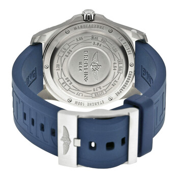 Titanium case with a blue rubber strap. Uni-directional rotating titanium bezel. Blue dial with luminous silver-toned hands and Arabic numeral hour markers. Minute markers around the outer rim. Dial Type: Analog-digital. Luminescent hands and markers. Perpetual calendar. Breitling Calibre 79 quartz movement. Scratch resistant sapphire crystal. Push / pull crown. Solid case back. Case size: 43 mm. Case thickness: 10.80 mm. Round case shape. Band width: 22 mm. Band length: 8 inches. Tang clasp. Water resistant at 100 meters / 330 feet. Functions: 12/24 hour format, alarm, countdown timer, chronograph, hour, minute, second. Luxury watch style. Watch label: Swiss Made. Item Variations: E7936310 C869BLPT3, E7936310.C869BLPT3, E7936310C869BLPT3. Breitling Aerospace Evo Blue Dial Blue Rubber Men's Watch E7936310-C869BLPT3.