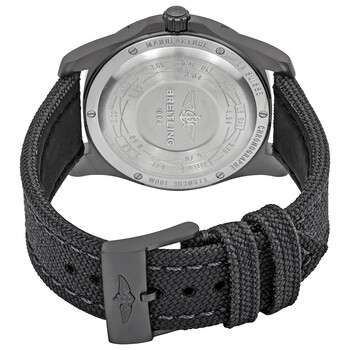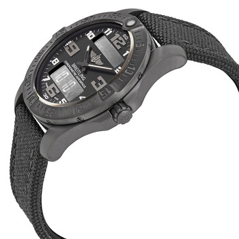 Black titanium case with a grey fabric strap. Uni-directional rotating black titanium bezel. Black dial with luminous black hands and Arabic numeral hour markers. Minute markers around the outer rim. Dial Type: Analog-digital. Luminescent hands and markers. Perpetual calendar - programmed for 4 years. Digital sub-dial. Breitling calibre 79 quartz movement. Scratch resistant sapphire crystal. Pull / push - two gaskets crown. Solid case back. Round case shape. Case size: 43 mm. Case thickness: 10.80 mm. Band width: 22 mm. Tang clasp. Water resistant at 100 meters / 330 feet. Functions: perpetual calendar, date, day, hour, minute, second, chronograph, alarm, digital minute repeater, GMT, countdown timer, power reserve indicator. Additional Info: chronograph/stopwatch - up to 1/100th of a second & capable of timing up to 48 hours,. Luxury watch style. Watch label: Swiss Made. Item Variations: V7936310/BD60-108W-M20BSA. Breitling Aerospace Evo Night Mission Black Dial Men's Watch V7936310/BD60GCVT.
