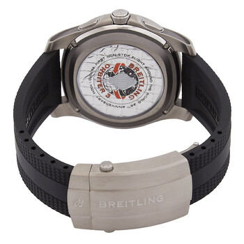 Silver-tone titanium case with a black rubber strap. Bi-directional rotating silver-tone titanium bezel. Digital dial with silver-tone hands and index-Arabic numeral hour markers. Minute markers around the outer rim. Dial Type: Analog-digital. Luminescent hands and markers. Breitling Calibre B70 quartz movement. Scratch resistant sapphire crystal. Screw down crown. Solid case back. Round case shape, case size: 43 mm, case thickness: 12.9 mm. Band width: 22 mm. Fold over clasp with a safety release. Water resistant at 100 meters / 330 feet. Functions: hour, minute, second. Aerospace Series. Sport watch style. Watch label: Swiss Made. Breitling Aerospace Quartz Analog-Digital Men's Watch EB70101A1O1S1.