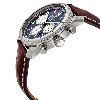 Stainless steel case with a brown (alligator) leather strap. Bi-directional rotating stainless steel bezel. Blue dial with luminous silver-tone hands and Arabic numeral hour markers. Minute markers around the outer rim. Dial Type: Analog. Luminescent hands and markers. Date display between the 4 and 5 o'clock positions. Chronograph - three white sub-dials displaying: 60 second, 30 minute and 12 hour. Breitling calibre 01 automatic movement, containing 47 Jewels, composed of 346 parts, bitting at 28800 vph, and has a power reserve of approximately 70 hours. Scratch resistant sapphire crystal. Screw locked crown. Transparent case back. Round case shape. Case size: 43 mm. Case thickness: 13.97 mm. Band width: 23 mm. Fold over clasp with a push button release. Water resistant at 100 meters / 330 feet. Functions: chronograph, column wheel, date, hour, minute, second, chronometer. Luxury watch style. Watch label: Swiss Made. Breitling Avaitor 8 Chronograph Automatic Blue Dial Men's Watch AB0119131C1P4.
