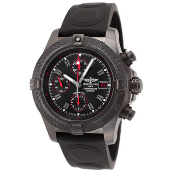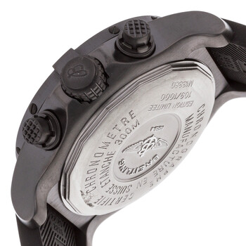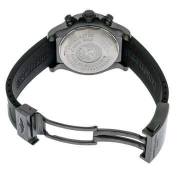 Black PVD stainless steel case with a black rubber strap. Uni-directional rotating black PVD bezel. Black dial with luminous hands and index hour markers. Minute markers. 1/100th scale around the outer rim. Dial Type: Analog. Luminescent hands and markers. Chronograph - three sub-dials displaying: 60 second, 30 minute and 12 hour. Automatic movement with 42 hour power reserve. Scratch resistant sapphire crystal. Screw locked crown. Solid case back. Case diameter: 45 mm. Case thickness: 18 mm. Round case shape. Band width: 21 mm. Band length: 8 inches. Fold over clasp. Water resistant at 300 meters / 1000 feet. Functions: chronograph, date, hour, minute, second. Dress watch style. Watch label: Swiss Made. Breitling Avenger Automatic Black Dial Black Rubber Men's Watch M133802C-BC73BKOD.