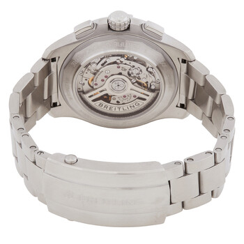 Silver-tone stainless steel case and bracelet. Bi-directional rotating silver-tone stainless steel bezel. Turquoise dial with silver-tone hands and index hour markers. Minute markers around the outer rim. Dial Type: Analog. Luminescent hands and markers. Chronograph - three sub-dials displaying: 60 second, 30 minute and 12 hour. Breitling Calibre 01 Automatic movement, containing 47 Jewels, composed of 346 parts, bitting at 28800 vph, and has a power reserve of approximately 70 hours. Scratch resistant sapphire crystal. Screw down crown. Transparent see through case back. Round case shape, case size: 44 mm, case thickness: 15.2 mm. Folding clasp. Water resistant at 300 meters / 1000 feet. Functions: chronograph, hour, minute, second. Avenger Series. Sport watch style. Watch label: Swiss Made. Breitling Avenger Chronograph Automatic Men's Watch AB0147101C1A1.