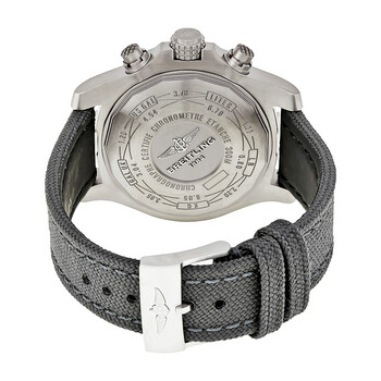 Titanium case with a green canvas strap. Uni-directional rotating titanium bezel. Grey dial with luminous silver-tone hands and Arabic numeral hour markers. Minute markers. 1/100th second scale around the outer rim. Dial Type: Analog. Luminescent hands and markers. Date display at the 3 o'clock position. Chronograph - three sub-dials displaying: 60 second, 30 minute and 12 hour. Breitling 13 automatic movement with a 42-hour power reserve. Scratch resistant sapphire crystal. Screw locked crown. Solid case back. Case size: 45 mm. Case thickness: 16.45 mm. Round case shape. Band width: 22 mm / 20 mm. Tang clasp. Water resistant at 300 meters / 1000 feet. Functions: chronograph, date, hour, minute, second. Luxury watch style. Watch label: Swiss Made. Breitling Avenger Bandit Automatic Men's Watch E1338310-M534-109X-A20BASA.1.