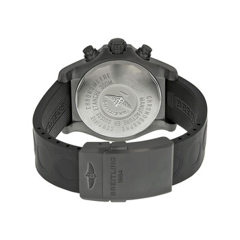 Black PVD stainless steel case with a black rubber strap. Unidirectional black PVD bezel. Black dial with luminous hands and index hour markers. Minute markers. 1/100th second scale appears around the outer rim. Dial Type: Analog. Luminescent hands and markers. Date display at the 3 o'clock position. Chronograph - three sub-dials displaying: 60 second, 30 minute and 12 hour. Automatic movement with a 42 hour power reserve. Scratch resistant sapphire crystal. Screw locked crown - two gaskets. Solid case back. Case diameter: 45 mm. Case thickness: 16.5 mm. Round case shape. Band width: 20 mm / 22 mm. Deployment clasp. Water resistant at 300 meters / 1000 feet. Functions: chronograph, date, hour, minute, second. Luxury watch style. Watch label: Swiss Made. Breitling Avenger Black Dial Black Rubber Automatic Men's Watch M133802C-BC73BKRD.