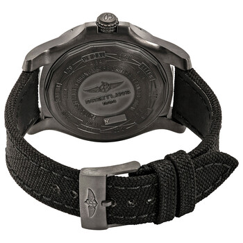 Stainless steel case with a military black fabric strap. Black bezel. Black dial with black hands and index hour markers. Minute markers around the outer rim. Dial Type: Analog. Luminescent hands and markers. Date display at the 3 o'clock position. Automatic movement. Scratch resistant sapphire crystal. Solid case back. Round case shape. Case size: 48 mm. Tang clasp. Water resistant at 300 meters / 1000 feet. Functions: date, hour, minute, second. Additional Info: limited edition of 200 pieces. Luxury watch style. Watch label: Swiss Made. Breitling Avenger BlackBird Automatic Black Dial Men's Watch V173102X/BE57/104W.