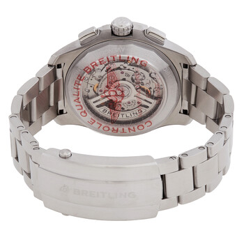 Silver-tone stainless steel case and bracelet. Bi-directional rotating silver-tone stainless steel bezel. Black dial with silver-tone hands and index hour markers. Minute markers around the outer rim. Dial Type: Analog. Luminescent hands and markers. Chronograph - three sub-dials displaying: 60 second, 30 minute and 12 hour. Breitling Calibre 01 Automatic movement, containing 47 Jewels, composed of 346 parts, bitting at 28800 vph, and has a power reserve of approximately 70 hours. Scratch resistant sapphire crystal. Screw down crown. Transparent see through case back. Round case shape, case size: 44 mm, case thickness: 15.2 mm. Folding clasp. Water resistant at 300 meters / 1000 feet. Functions: chronograph, hour, minute, second. Avenger Series. Sport watch style. Watch label: Swiss Made. Breitling Avenger Chronograph Automatic Black Dial Ladies Watch AB0147101B1A1.