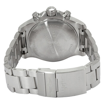 Silver-tone stainless steel case and bracelet. Uni-directional rotating silver-tone stainless steel bezel. Black dial with luminous silver-tone hands and index hour markers. Minute markers. 1/100th second markers around the outer rim. Dial Type: Analog. Luminescent hands and markers. Date display at the 3 o'clock position. Chronograph - three sub-dials displaying: 60 second, 30 minute and 12 hour. Breitling Calibre 13 Automatic movement, based upon ETA Valjoux 7750, containing 25 Jewels, bitting at 28800 vph, and has a power reserve of approximately 42 hours. Scratch resistant sapphire crystal. Screw locked crown. Solid case back. Round case shape, case size: 45 mm, case thickness: 16.46 mm. Band width: 22 mm. Fold over clasp with a safety release. Water resistant at 300 meters / 1000 feet. Functions: chronograph, date, hour, minute, second, chronometer. Avenger Chronograph Series. Dive watch style. Watch label: Swiss Made. Breitling Avenger Chronograph Automatic Black Dial Men's Watch A13317101B1A1.