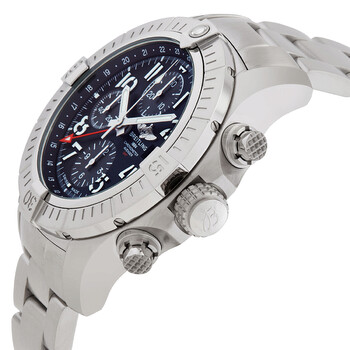 Silver-tone stainless steel case and bracelet. Uni-directional rotating silver-tone stainless steel bezel. Black dial with silver-tone hands and index-Arabic numeral hour markers. Minute markers around the outer rim. Dial Type: Analog. Luminescent hands and markers. Date display at the 3 o'clock position. Chronograph - three sub-dials displaying: 60 second, 30 minute and 12 hour. Breitling Calibre 24 Automatic movement, based upon ETA 7754, containing 25 Jewels, bitting at 28800 vph, and has a power reserve of approximately 42 hours. Scratch resistant sapphire crystal. Screw down crown. Solid case back. Round case shape, case size: 45 mm, case thickness: 16.4 mm. Band width: 22 mm. Fold over clasp with a safety release. Water resistant at 300 meters / 1000 feet. Functions: chronograph, GMT, second time zone, hour, minute, small second, chronometer. Avenger Series. Sport watch style. Watch label: Swiss Made. Breitling Avenger Chronograph GMT Automatic Chronometer Black Dial Men's Watch A24315101B1A1.