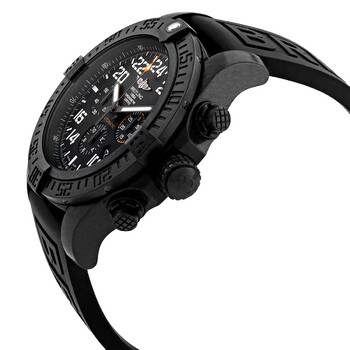Black ultralight polymer (breitlight) case with a black rubber strap. Uni-directional rotating black ultralight polymer (breitlight) bezel. Black dial with luminous grey hands and Arabic numeral (24 hour scale) hour markers. Minute markers. 1/10th second markers around the outer rim. Dial Type: Analog. Luminescent hands and markers. Date display between the 4 and 5 o'clock positions. Chronograph - three sub-dials displaying: 60 second, 30 minute and 12 hour. Breitling Calibre 01 Automatic movement, containing 47 Jewels, composed of 346 parts, bitting at 28800 vph, and has a power reserve of approximately 70 hours. Scratch resistant sapphire crystal. Screw down crown. Solid case back. Round case shape, case size: 50 mm, case thickness: 16.97 mm. Band width: 24 mm. Deployment with push button release clasp. Water resistant at 100 meters / 330 feet. Functions: chronograph, column wheel, date, hour, minute, second, chronometer. Avenger Hurricane 50 Series. Luxury watch style. Watch label: Swiss Made. Item Variations: XB1210E4 BE89 155S X20D. Breitling Avenger Hurricane 50 Chronograph Automatic Chronometer Black Dial Men's Watch XB1210E41B1S1.