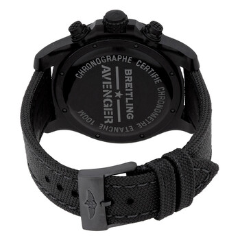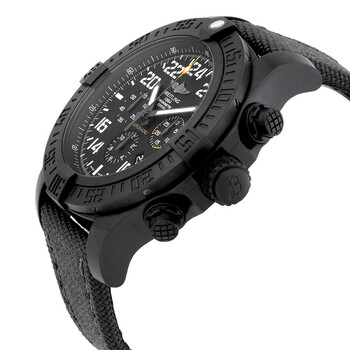 Black Breitlight (ultralight polymer) case with a black fabric strap. Uni-directional rotating black Breitlight (ultralight polymer) bezel. Black dial with luminous black hands and Arabic numeral 24 hour markers. Minute markers. 1/100th second markers around the outter rim. Dial Type: Analog. Luminescent hands and markers. Date display between the 4 and 5 o'clock positions. Chronograph - three sub-dials displaying: 60 second, 30 minute and 12 hour. Breitling calibre B12 automatic movement, containing 47 Jewels, bitting at 28800 vph, and has a power reserve of approximately 70 hours. Scratch resistant sapphire crystal. Screw down crown. Solid case back. Round case shape. Case size: 50 mm. Case thickness: 16.97 mm. Band width: 24 mm. Tang clasp. Water resistant at 100 meters / 330 feet. Functions: chronograph, column wheel, date, hour, minute, small second, chronometer. Sport watch style. Watch label: Swiss Made. Breitling Avenger Hurricane Chronograph Automatic Black Dial Men's Watch XB1210E41B1W1.