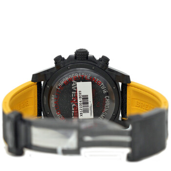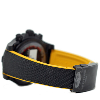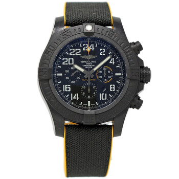 Black ultralight polymer case with a black fabric (inner rubber) strap. Uni-directional rotating black bezel. Black dial with grey hands and Arabic numeral hour markers. Minute markers around the outer rim. Dial Type: Analog. Luminescent hands and markers. Date display between 4 and 5 o'clock position. Chronograph - three sub-dials displaying: 60 second, 30 minute and 12 hours. Breitling Calibre B12 Automatic movement, containing 47 Jewels, bitting at 28800 vph, and has a power reserve of approximately 70 hours. Scratch resistant sapphire crystal. Screw down crown. Solid case back. Round case shape, case size: 50 mm, case thickness: 16.97 mm. Band width: 24 mm. Deployment with push button release clasp. Water resistant at 100 meters / 330 feet. Functions: chronograph, date, hour, minute, second. Sport watch style. Watch label: Swiss Made. Breitling Avenger Hurricane Chronograph Automatic Black Dial Men's Watch XB1210E4/BE89-257S-X20D.4.
