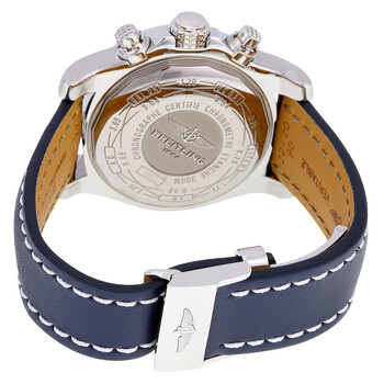 Stainless steel case with a blue leather strap. Uni-directional rotating stainless steel bezel. Blue dial with luminous hands and Arabic numeral hour markers. Minute markers. 1/100th second markers around the outer rim. Dial Type: Analog. Luminescent hands and markers. Date display at the 3 o'clock position. Chronograph - three sub-dials displaying: 60 second, 30 minute and 12 hour. Automatic movement with a 42 hour power reserve. Scratch resistant sapphire crystal. Screw down crown. Solid case back. Case diameter: 43 mm. Case thickness: 16.5 mm. Round case shape. Band width: 22 mm / 20 mm. Deployment clasp. Water resistant at 300 meters / 1000 feet. Functions: chronograph, date, hour, minute, second. Luxury watch style. Watch label: Swiss Made. Item Variations: A1338111/C870 112X-A20D.1. Breitling Avenger II Automatic Blue Dial Blue Leather Men's Watch A1338111-C870BLLD.