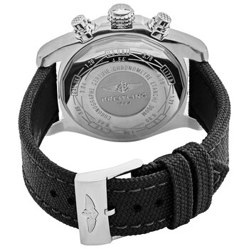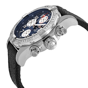 Silver-tone stainless steel case with a anthracite fabric strap. Uni-directional rotating arabic numeral silver-tone stainless steel bezel. Mariner blue dial with silver-tone hands and Arabic numeral hour markers. Minute markers around the outer rim. Dial Type: Analog. Luminescent hands and markers. Date display at the 3 o'clock position. Chronograph - three sub-dials displaying: 60 second, 30 minute and 12 hours. Breitling Calibre 13 Automatic movement, based upon ETA Valjoux 7750, containing 25 Jewels, bitting at 28800 vph, and has a power reserve of approximately 42 hours. Scratch resistant sapphire crystal. Screw down crown. Solid case back. Round case shape, case size: 43 mm, case thickness: 16.50 mm. Band width: 22 mm. Tang clasp. Water resistant at 300 meters / 1000 feet. Functions: chronograph, date, hour, minute, second, chronometer. Dive watch style. Watch label: Swiss Made. Breitling Avenger II Chronograph Automatic Mariner Blue Dial Men's Watch A13381111C1W1.