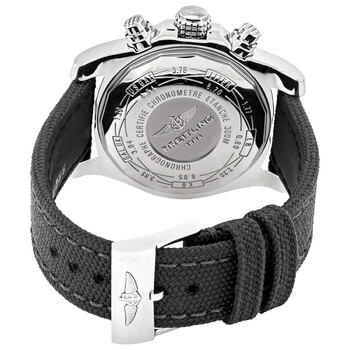 Stainless steel case with a anthracite fabric strap. Uni-directional rotating stainless steel bezel. Volcano black dial with luminous silver-tone hands and index hour markers. Minute markers. 1/100th second markers around the outer rim. Dial Type: Analog. Luminescent hands and markers. Date display at the 3 o'clock position. Chronograph - three sub-dials displaying: 60 second, 30 minute and 12 hours. Breitling calibre 13 automatic movement, based upon ETA Valjoux 7750, containing 25 Jewels, bitting at 28800 vph, and has a power reserve of approximately 42 hours. Scratch resistant sapphire crystal. Screw locked crown. Solid case back. Round case shape. Case size: 43 mm. Case thickness: 16.50 mm. Band width: 22 mm. Tang clasp. Water resistant at 300 meters / 1000 feet. Functions: chronograph, date, hour, minute, second, chronometer. Dive watch style. Watch label: Swiss Made. Breitling Avenger II Chronograph Automatic Volcano Black Dial Men's Watch A13381111B1W1.