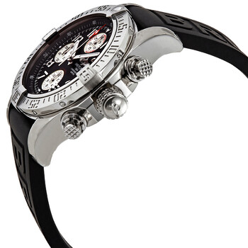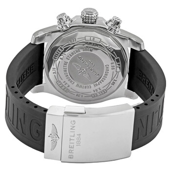 Stainless steel case with a black rubber strap. Uni-directional rotating stainless steel bezel. Volcano black dial with luminous silver-tone hands and Arabic numeral hour markers. Minute markers. 1/100th second markers around the outer rim. Dial Type: Analog. Luminescent hands and markers. Date display at the 3 o'clock position. Chronograph - three silver sub-dials displaying: 60 second, 30 minute and 12 hours. Breitling calibre 13 automatic movement, based upon ETA Valjoux 7750, containing 25 Jewels, bitting at 28800 vph, and has a power reserve of approximately 42 hours. Scratch resistant sapphire crystal. Screw locked crown. Solid case back. Round case shape. Case size: 43 mm. Case thickness: 16.50 mm. Band width: 22 mm. Fold over clasp. Water resistant at 300 meters / 1000 feet. Functions: chronograph, date, hour, minute, second, chronometer. Dive watch style. Watch label: Swiss Made. Breitling Avenger II Chronograph Automatic Volcano Black Dial Men's Watch A13381111B2S1.