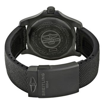 Black stainless steel case with a black fabric strap. Bi-directional rotating black stainless steel bezel. Black dial with luminous grey hands and index hour markers. Minute markers. 24 hour markers around the outer rim. Dial Type: Analog. Luminescent hands and markers. Date display at the 3 o'clock position. Breitling calibre 32 automatic movement with a 42-hour power reserve. Scratch resistant sapphire crystal. Screw down crown. Solid case back. Round case shape. Case size: 43 mm. Case thickness: 12.20 mm. Band width: 22 mm. Deployment clasp. Water resistant at 300 meters / 1000 feet. Functions: GMT, second time zone, hour, minute, second, date. Dive watch style. Watch label: Swiss Made. Breitling Avenger II GMT Automatic Black Dial Men's Watch M3239010/BF04-253S.